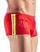 Knallrote Pants im Feuerwehrmann-Look für fantasievolle Rollenspiele. Mit Reflektorstreifen, Ziertasche und raffiniertem Reißverschluss in der Front. Dazu sorgt die Swellfunktion für eine beeindruckende Frontwölbung.