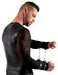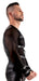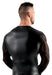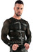 Langarm-Shirt von Svenjoyment Bondage aus elastischem weichem Powernet mit aufgestepptem und mit Ringen besetztem Harness vorne. Rücken komplett im trendigen Mattlook. Lange Powernet-Ärmel am Ende mit aufgesteppten Mattlook-Fesselriemen, die mit Ringen versehen sind, in die beiliegende kurze Verbindungskette mit den Karabinern handfesselnd eingehakt werden kann.