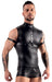 Top von Svenjoyment Bondage im schwarzen trendigen Mattlook mit Nieten besetztem Harness (nicht abnehmbar). Harness seitlich mit Ringen, in die beiliegende Fesselriemen für die Arme befestigt werden können. Die Fesselriemen im Mattlook haben verstellbare Klettverschlüsse.