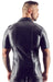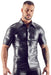 Druckknopfleiste, Schulterklappen und Brusttasche dominieren das Hemd aus glänzend schwarzem Lederimitat. Muskelbetonend geschnitten und leicht tailliert. Top auch zu Jeans!