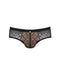 Schwarzer Jock Severio von Obsessive in extravagant gemusterter Transparenz mit blickdicht unterlegtem Beutel. Weich und elastisch für vollen Komfort. Bequemer Gummibund mit kleinem Metall-Element vorne. Bequeme Jock-Straps lassen den Po aufregend frei, pushen und betonen.