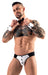 Set von Svenjoyment bestehend aus Jockslip, 2 Handgelenk-Manschetten und Fliege. Jockslip vorne mit adrettem Nadelstreifen-Einsatz mit Deko-Knöpfen, aufregend po-frei!