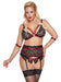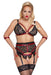 Softer BH, Strapsgurt und Slip ouvert von Cottelli BONDAGE aus elastischer schwarzer Spitze mit raffinierten Details im dunkelroten Mattlook sowie roségoldfarbenen Elementen und coolem Nietenbesatz. BH mit etwas breiteren, verstellbaren Trägern, hinten mit Hakenverschluss. An den Strapsgurt können seitlich an Ringen die beiliegenden Armfesseln mit ihren Karabinerketten eingehakt werden. Der Strapsgurt hat hinten einen Hakenverschluss und verstellbare Strapse. Der bis über den Po schrittoffene Slip komplettiert dieses aufregende Trio.