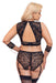 Bralette, Straps-Slip ouvert und Armfesseln im Set von Cottelli BONDAGE PLUS aus weicher elastischer Spitze mit roségoldfarbenen Details. Die elastischen Armfesseln sind mit ihren Karabiner-Ketten von den seitlichen Ringen des Slips abnehmbar. Das Bralette verführt mit Stretchbändern und Ringen im Dekolleté und einer raffinierten freien Rückansicht. Es hat hinten einen Hakenverschluss sowie einen kleinen Clipverschluss oben im Nacken. Der Straps-Slip ist im Schritt einladend offen, die verstellbaren Strumpfhalter sind vom Slip abnehmbar.
