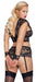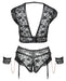 BH und Straps-Slip ouvert von Cottelli BONDAGE aus weicher elastischer Spitze mit Mattlook-Streifen und roségoldfarbenen Elementen. Für fesselnde Lustmomente sorgen die Spitzen-Handfesseln, die mit Karabinerketten an den seitlichen Ringen des Slips befestigt werden können. Der Soft-BH ist etwas länger geschnitten und im tiefen Ausschnitt vorne mit einem Riemenkreuz aus Stretchbändern versehen. Im Nacken hat der BH einen Clip-, im Rücken einen Hakenverschluss. Der Slip ist im Schritt einladend offen. Die verstellbaren Strapse sind vom Slip abnehmbar.