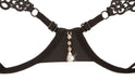 Der BH mit den offenen Cups besteht nur aus Bügeln und Bändern und lässt daher tief blicken, denn die Brustwarzen sind nur durch eine Stickerei bedeckt. Im Rücken verfügt der BH über einen Hakenverschluss und die Träger sind in der Länge verstellbar. Der passende String ist im Schritt einladend ouvert und verfügt ebenfalls über eine edle Stickerei in der Front, die über drei kleine silberfarbene Ringe mit den Bändern verbunden ist.