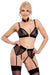 Soft-BH und Straps-Slip ouvert im Set von Abierta Fina. Beide Teile in schwarzer Stretch-Transparenz mit raffinierten Details aus Samt und roségoldfarbenen Metallelementen. Der aufregende BH fasziniert mit seinen schillernden Kettchen, die zum Samt-Halsband und über die Schulter führen - und die geschlitzten Cups sind Verlockung pur. Der Straps-Slip provoziert mit seinem komplett offenen Schritt, durch den ein stimulierendes Kettchen führt. Der Venushügel wird zusätzlich von einem Strassring geschmückt. Die Strumpfhalter und BH-Träger sind für optimale Passform verstellbar. Die Kettchen sind alle abnehmbar.