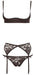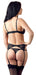 Hebe, Riostring ouvert und Strapsgurt im Set. Alle drei Teile aus schwarzer, elastischer Spitze. Hebe mit leicht gepolsterten Bügel-Cups, Riostring im Schritt erregend offen.