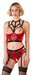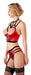 Sinnliches Satin-Bustier mit leicht gefütterter Bügel-Hebe und verstellbaren Riemchen-Details inklusive verstellbaren Halsband. Mit semitransparenten Spitzeneinsätzen und einer Zierschnürung an der Unterbrust. Ein Strass-Ring vorne am Bund komplementiert den Auftritt. Der passende, schrittoffene Slip ist taillenhoch geschnitten und hat verstellbare, abnehmbare Strapsen. An den Hüften wird er durch 3 elastische Bänder gehalten. Mit einem weiterer Strass-Ring am Bund und semitransparenten Spitzeneinsätze vorne und hinten.