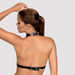 Schwarzer Ouvert-BH A740 von Obsessive aus weichen Lederimitat-Riemen mit dekorativen Ringen. Der Unterbrustriemen ist im Rücken mit Schnallenverschluss passend verstellbar, genauso wie der Neckholder.