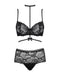 3-teiliges schwarzes Set Raquelia von Obsessive mit Bügel-BH, High Waist String und Brustharness. BH und String aus weicher elastischer Blütenspitze. Bügel-BH mit verstellbaren Trägern und verstellbarem Hakenverschluss im Rücken. Taillenhoch geschnittener String mit blickdichtem Schritt. Bund mit Wimpernspitze und Satinschleifchen hinten verziert. Brustharness mit Verschluss im Nacken und am verstellbaren Taillenriemen. Vorne mit Satinschleife verziert.