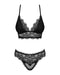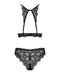 Schwarzes Dessous-Set Renelia von Obsessive mit Bügel-BH und String aus bildschöner, weicher Stretchspitze. Bügel-BH mit Schmuckelement zwischen den gepolsterten Cups. Im Rücken stylisches Spitzen-Detail mit kleinem Verschluss sowie verstellbarer Hakenverschluss. Auch die Träger sind passend verstellbar. Der String betont mit seinem hohen Spitzenbund sexy den Po.