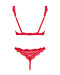 Rotes Ouvert-Set Bergamore von Obsessive mit Bügel-BH und String. Aus weicher elastischer BlütenSpitze. Eingearbeitete Cup-Bügel heben und stützen den freien Busen. Der Hakenverschluss im Rücken und die Träger sind passend verstellbar. Der String ist im Schritt verführerisch offen.