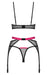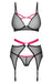 3-teiliges Straps-Set Novenes von Obsessive mit Soft-BH, Strapsgürtel und V-String. Aus feinem schwarzem Powernet mit pinkfarbenen Akzenten. BH mit Dekolleté-Riemchen und schönem Strasselement zwischen den soften Cups. Die Träger sind passend verstellbar. Genauso wie der Hakenverschluss im Rücken. Der schöne Strapsgürtel verführt mit kontrastfarbigem Taillenbund und Ring vorne. Im Rücken mit verstellbarem Hakenverschluss und auch die Strumpfhalter sind passend verstellbar. Der dazu passende V-String komplettiert dieses elegante Transparent-Trio.
