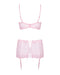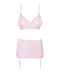 Bügel-BH, Strapsgurt und String im Set Girlly von Obsessive. Weiches weißes Stretchmaterial mit roséfarbener elastischer Spitze. Leicht gepolsterter Bügel-BH im Rücken mit verstellbarem Hakenverschluss. Die Träger sind passend verstellbar, genauso wie die Strumpfhalter des Strapsgurtes. Der breite Strapsgurt ist im Rücken mit einer variablen Schnürung versehen.