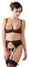 Die Bügel-Hebe mit Hakenverschluss überzeugt mit Strass-Steinen besetzten, leicht gefütterten Cups, zwischen denen ein Strass-Detail glänzt. Ebenfalls edler Strass-Schmuck befindet sich am Verschluss des Strapsgurtes sowie am String, der mit einladend offenem Schritt lockt. Träger und Strapse verstellbar.