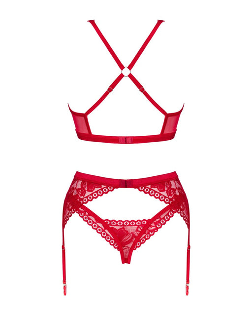 Attraktion in Liebesrot!3-teiliges Straps-Set Lacelove von Obsessive mit Bügel-BH, Strapsgurt und String. Aus bildschöner roter Spitze – rundum wei...