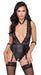 Extra tief dekolletierter Strapsbody ouvert von Cottelli BONDAGE mit transparentem Oberteil aus feiner Spitze und schrittoffenem Slipteil im edlen Mattlook. Im Rücken ebenfalls ein tiefer V-Ausschnitt mit Stretchbändern, die alles schön zusammenhalten. An dem Gürtel sind an Ringen die Strumpfhalter fest angebracht. Am Frontring des Gürtels kann die Karabinerkette mit dem Halsband befestigt werden - und an den Ringen seitlich die beiliegenden Fesselriemen mit den Karabinerketten. Gürtel und Strumpfhalter sind in der Passform verstellbar, der Gürtel mit den Strapsen kann auch ganz abgenommen werden. Die Fesselriemen haben verstellbare Klettverschlüsse.