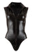 Hochgeschlossener schwarzer Body mit schwarzem 2-Wege-Reißverschluss vom Hals durch den Schritt bis über den Po. Elastisches Material. 92% Polyester, 8% Elasthan.