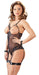 Busenfreier Strapsbody aus Powernet und Spitze mit Metalldetails und Wetlook-Accessoires. Durch den komplett offenen Schritt verläuft eine abnehmbare (Karabinerhaken), stimulierende Kette. Träger verstellbar, Strumpfhalter verstell- und abnehmbar. Oberschenkelriemen über kurze Kette mit abnehmbaren (Karabinerhaken) Handfesseln verbunden. Riemen und Fesseln mit Klettverschluss. Schwarz. 90% Polyamid, 10% Elasthan; Wetlook 92% Polyester, 8% Elasthan.
