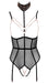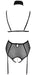 Busenfreier Body von Abierta Fina mit komplett offenem Schritt aus Powernet mit elastischen Samtstreifen und roségoldfarbenen Schmuckelementen. Träger und Strapse verstellbar, Strapse auch abnehmbar. Verstellbarer Dekolletésteg mit Ketten verziertem Halsband (mit Knopfverschluss) ebenfalls abnehmbar, genauso wie die mit kleinen Karabinern versehenen Brustketten und die mit dekorativem Ring versehene Schrittkette. Alle Ketten sind zusätzlich mit kleinen Strasssteinen verziert. Rückansicht in Zweiteiler-Optik mit zwei Clipverschlüssen an BH und Höschen/Strapsgurtbund.