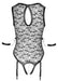 Straps-Body von Cottelli BONDAGE aus zarter weicher Spitze mit aufregenden Details im Mattlook. Vorne mit einem Harness aus weichen Mattlook-Riemen und Ringen besetzt. An die seitlichen Ringe in der Taille können die beiliegenden Soft-Fesselriemen für die Arme mit ihren Karabinerketten leicht eingehakt werden. Der komplett offene Schritt ist mit einer abnehmbaren, stimulierenden Schrittkette versehen. Den Halsausschnitt ziert vorne ein kleiner Ring und wird hinten mit einem kleinen Druckknopf geschlossen. Fesselriemen mit verstellbaren Klettverschlüssen. Die verstellbaren Strapse sind abnehmbar.