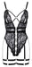 Schwarzer Stringbody ouvert von Cottelli LINGERIE mit Strapsen und Schenkel-Harnessen (alles abnehmbar). Body aus schwarzer weicher Stretch-Blütenspitze. Vorne komplett offen, dekorative silberfarbene Ringe halten alles fest zusammen. Auch im Schritt verführerisch offen. Spitzen-Cups mit kleinen Hakenverschlüssen zum Öffnen sowie stylischen Riemchen und Ring. In der Taille passend verstellbare elastische Samtbänder. Auch die Träger und die Schenkel-Harnesse sind aus elastischen Samtbändern gefertigt und passend verstellbar. Der Schenkelschmuck kann mitsamt der Strapse auch komplett abgenommen werden.