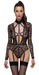 Langarm-Riobody von Cottelli LINGERIE komplett aus feiner weicher Spitze mit raffinierten Details im Mattlook. Rundum elastisch und soft anschmiegsam für hautnahen Sitz mit höchsten Tragekomfort. Vorne bis zum Bauchnabel tief ausgeschnitten und in provokanter Harness-Optik mit Stretchbändern und Ringen. Auch im großzügigen Rückenausschnitt halten dekorative Stretchbänder alles schön zusammen. Der hohe Spitzenkragen wird im Nacken mit 2 Knöpfen geschlossen. Im Schritt mit Druckknopfverschluss. Die Strumpfhalter sind verstell- und auch komplett abnehmbar.