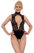 Aufsehenerregender Body von Abierta Fina in Zweiteiler-Optik aus feiner weicher Spitze und edlem Stretchsatin. Trotz hohem braven Stehkragen zum Knöpfen ungemein provozierend durch den großen Ausschnitt vorne und im Rücken. Als Eyecatcher fungieren zusätzlich ein kleiner Strassanhänger am Kragen und ein schillerndes Strasskettchen in der Front. Ebenfalls sehr verlockend ist der komplett offene Schritt, durch den ein stimulierendes Kettchen führt, das auch abgenommen werden kann.
