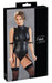 Strapsbody im schwarzen elastischen Mattlook mit Metall-Accessoires. Über den Brüsten Reißverschlüsse, Front mit Nieten verziert. Jeweils seitlich Armschlaufe mit Klettverschluss. Reißverschluss im Rücken. Durch den Schritt verläuft ein 2-Wege-Reißverschluss. Strumpfhalter verstell- und abnehmbar. 90% Polyester, 10% Elasthan. Ohne Strümpfe.