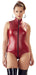 Hochgeschlossener bordeauxfarbener Body mit schwarzem 2-Wege-Reißverschluss vom Hals durch den Schritt bis über den Po. Matt glänzendes, elastisches Material. 85% Polyester, 15% Elasthan.