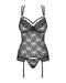 Strapshemd und String im Set 860-COR-1 von Obsessive. Komplett aus elastischer Blütenspitze, die sich hautnah weich anschmiegt. Figurbetonendes Strapshemd mit Schmuckelement zwischen den Bügel-Cups und stylischen Cup-Riemchen. Die Doppelträger kreuzen sich im freien Rücken und sind passend verstellbar – genauso wie die Strumpfhalter.