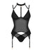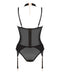 Schwarzes Set Brasica von Obsessive mit Strapshemd und Slip. Zarter transparenter Stretchtüll mit blickdichten Details und in figurschmeichelnder Streifenoptik seitlich. Rundum weich und elastisch für hohen Tragekomfort. Anschmiegsames Strapshemd mit Bügel-Cups und stylischen, passend verstellbaren Riemchen im Dekolleté. Neckholder-Halsband im Choker-Style mit verstellbarem Kettchenverschluss im Nacken. Auch die Träger und Strumpfhalter sind passend verstellbar. Genauso wie die Hakenverschlussleiste im Rücken.