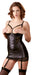 Körperbetontes Dessouskleid mit leicht gefütterter Hebe und Riemchen-Details. In der Front mit Schnürung und Zierring. Edle Spitzeneinsätze vorne und am Saum machen den sexy Look perfekt. Träger verstellbar. Riemchen und Strapse verstell- und abnehmbar. Goldfarbene Metall-Details.