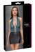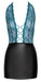 Eng geschnittenes kurzes Kleid von Cottelli LINGERIE in Zweiteiler-Optik mit Oberteil aus feiner petrolfarbener Spitze und Rockteil im edlen schwarzen Mattlook. Bis zum Bauchnabel tief dekolletiert - 3 roségoldfarbene Ringe und Stretchbänder halten alles schön zusammen. Rückenfrei, der Neckholder hat einen Clipverschluss.