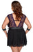 Babydoll, Halsband und Armfesseln im Set von Cottelli BONDAGE PLUS. Kurzes ausgestelltes Babydoll aus weicher lilafarbener Stretch-Blütenspitze mit schwarzem doppellagigem Röckchen aus elastischem feinem Powernet. Schwarze Mattlook-Details und silberfarbene Ring- und Ketten-Accessoires unterstreichen den fesselnd verspielten Look. Im tiefen Dekolleté halten zwei dekorative Ring-Riemchen alles schön zusammen. Auch im tiefen Rückenausschnitt ein verbindendes Stretchband. Für lustvolle Fesselungen werden in die seitlichen Ringe des festen Unterbrustbandes die soften Armfesseln mit ihren Karabinerketten eingehakt. Die Fesseln sind mit Klettverschlüssen passend verstellbar. Das schmale Halsband mit Frontring und verstellbarem Klettverschluss im Nacken komplettiert dann den Bondage-Style.