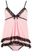 Babydoll und String im Set. Kurzes, weit ausgestelltes Babydoll aus doppellagigem Powernet gearbeitet und mit Spitze aufwändig verziert. Träger zum Binden.