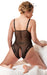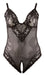 Edler Body ouvert aus semitransparentem Powernet mit verstellbaren Trägern. Mit zarter Blütenspitze an den Cups, die in Richtung Körpermitte spitz ausläuft. Die Beinabschüsse vorne und hinten sind ebenfalls mit Blütenspitze verziert.
