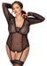 Schwarz-transparenter Langarm-Body ouvert von Cottelli CURVES aus feinem Powernet mit Einsätzen aus zarter Spitze. Rundum elastisch und soft anschmiegsam für hautnahen Sitz mit höchsten Tragekomfort. Im Rücken großer Ausschnitt, Clipverschluss im Nacken. Im Schritt bis über den Po einladend offen. Die beiden Strumpfhalter vorne sind verstell- und auch komplett abnehmbar.