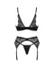 3-teiliges schwarzes Set Bellastia von Obsessive mit Bügel-BH, Strapsgurt und String. Weiches Stretchmaterial und softe elastische Blütenspitze im verführerischen Mix. BH mit Schmuckelement zwischen den Bügel-Cups und verstellbarem Hakenverschluss im Rücken. Auch die hinten mit Spitze besetzten Träger und die Strumpfhalter sind passend verstellbar.