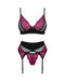 3-teiliges elegantes Straps-Set Rosenty von Obsessive mit Bügel-BH, Strapsgurt und String. Weiches schwarzes Netz und feine pinkfarbene Rosenspitze im stylischen Mix mit blickdichtem schwarzem Stretchmaterial. BH mit Schmuckelement zwischen den Bügel-Cups und verstellbarem Hakenverschluss im Rücken. Auch die Träger sind passend verstellbar. Genauso wie die Strumpfhalter und der Hakenverschluss des Strapsgurtes.