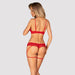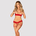 Bügel-Hebe und String als rotes Ouvert-Set Ingridia von Obsessive. Aus weicher elastischer Spitze und Stretchmaterial. Gepolsterte Bügel-Cups heben und stützen den freien Busen. Der BH-Hakenverschluss im Rücken und die Träger sind passend verstellbar. Schrittoffener Spitzen-String mit fest angenähten verstellbaren Strapsriemchen, die Po und Schenkel aufregend betonen.