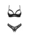 Set Serafia von Obsessive mit Bügel-BH und Riostring im Ouvert-Style. Aus bildschöner schwarzer Blütenspitze. Rundum weich und elastisch für hohen Tragekomfort. Der Bügel-BH mit offenen, unten gepolsterten Cups und oberen Cup-Riemchen stützt den freiliegenden Busen perfekt. Die Träger und der Hakenverschluss im Rücken sind passend verstellbar. Der schöne String verführt mit kleiner Zierschnürung über dem Po und ist im Schritt einladend offen.