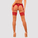 Nudefarbene Straps-Strümpfe Lacelove von Obsessive mit roten elastischen Spitzen-Abschlüssen zum Anclipsen. Weich und seidig anschmiegsam.