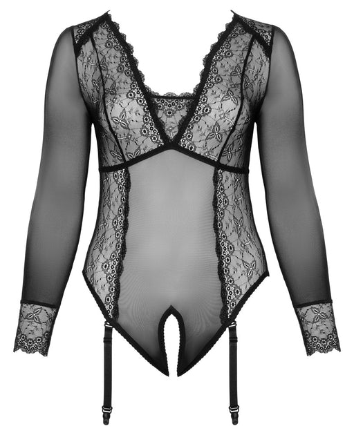 Zarte Transparenz unverschämt ouvert!Schwarz-transparenter Langarm-Body ouvert von Cottelli CURVES aus feinem Powernet mit Einsätzen aus zarter Spi...