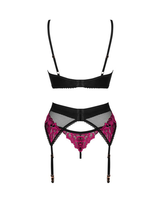 Rosige Verführung!3-teiliges elegantes Straps-Set Rosenty von Obsessive mit Bügel-BH, Strapsgurt und String. Weiches schwarzes Netz und feine pinkf...