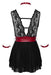 Kurzes schwarzes Babydoll von Cottelli BONDAGE im Mix aus zarter Spitze (Top) und feinem Powernet (Rock) mit taillenbetonendem Kontrast-Einsatz im edlen roten Mattlook. Und auch der Gürtel mit seinen beiden Handfesselriemen an Karabinerketten und das Halsband kommen im roten Mattlook daher. Das Babydoll ist vorne sowie hinten extra tief ausgeschnitten, das ausgestellte Röckchen ist doppellagig gearbeitet. An dem Halsband mit Druckknopfverschluss kann vorne in den Ring die beiliegende Karabinerkette eingehakt werden. Der Gürtel und die Handfesselriemen mit Klettverschlüssen sind passend verstell- und auch komplett abnehmbar.