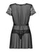 Eleganter kurzer Kimono und String im Set Alluria von Obsessive. Feine schwarze Tüll-Transparenz mit kurzen Spitzen-Ärmeln und Spitzenfront. Rundum weich und elastisch für hohen Tragekomfort. Vorne komplett offen mit Satingürtel zum Binden. String komplett aus weicher elastischer Blütenspitze.