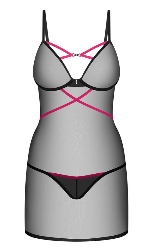 ObsessiveAuf LagerRaffinierte Transparenz!2-teiliges Dessous-Set Novenes von Obsessive mit Negligé und String. Aus feinem schwarzem Powernet mit pinkfarbenen Riemche...