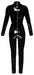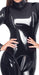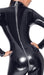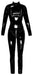 Schwarzer Lack-Overall von Black Level in figurnaher Schnittführung mit langem Arm und Bein. Der praktische und zugleich erotische 2-Wege-Reißverschluss im Rücken verläuft vom Stehkragen durch den Schritt bis kurz unter den Bauchnabel und lässt sich von beiden Seiten öffnen. Auch die unterlegten Reißverschlüsse über den Brüsten sind fix geöffnet.
